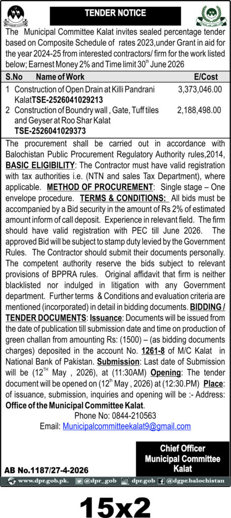 The Municipal Committee Kalat is procuring construction works for the fiscal year 2024-25 under a grant in aid. The procurement includes the construction of an open drain at Killi Pandrani and the construction of a boundary wall with gate, tuff tiles, and geyser at Roo Shar Kalat. These projects are located in Kalat, Balochistan, and are based on the Composite Schedule of Rates 2023. The total estimated cost for the open drain is approximately PKR 3.37 million and for the boundary wall project about PKR 2.19 million.