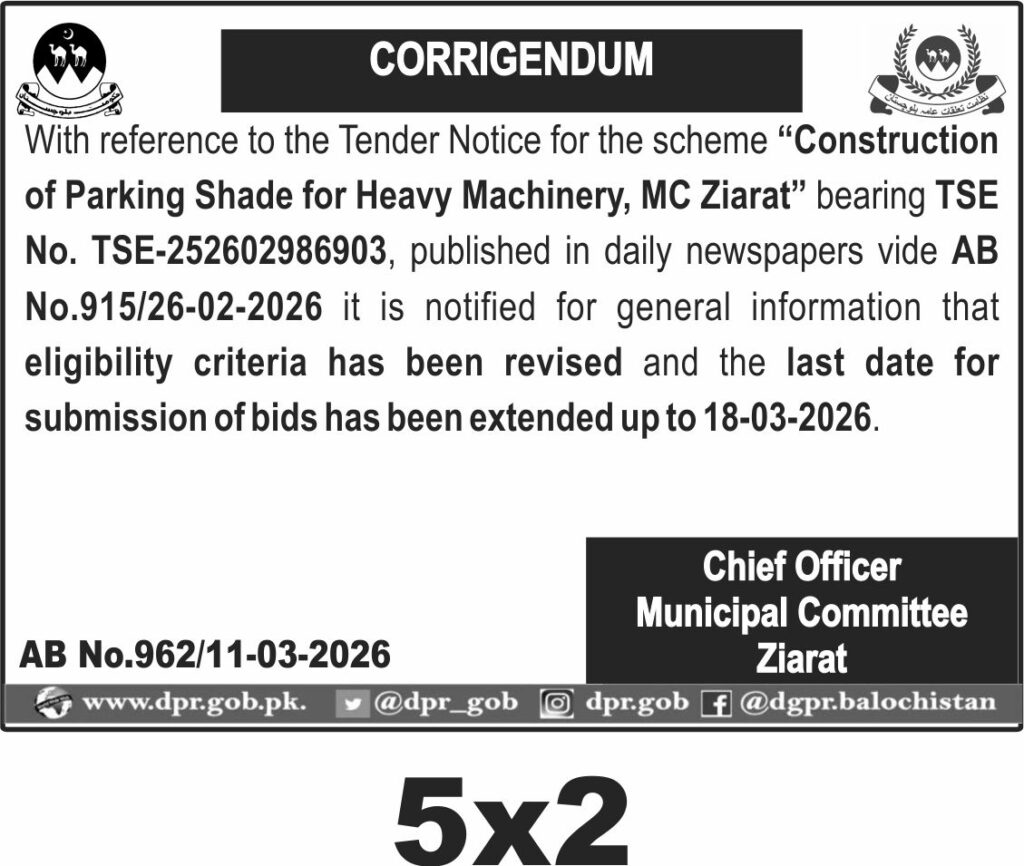 This tender notice from Municipal Committee Ziarat in Balochistan invites contractors for the construction of a parking shade designed specifically for heavy machinery. The project is categorized under construction and civil works materials, reflecting the need for durable structural components suitable for the local terrain and climate of Ziarat.