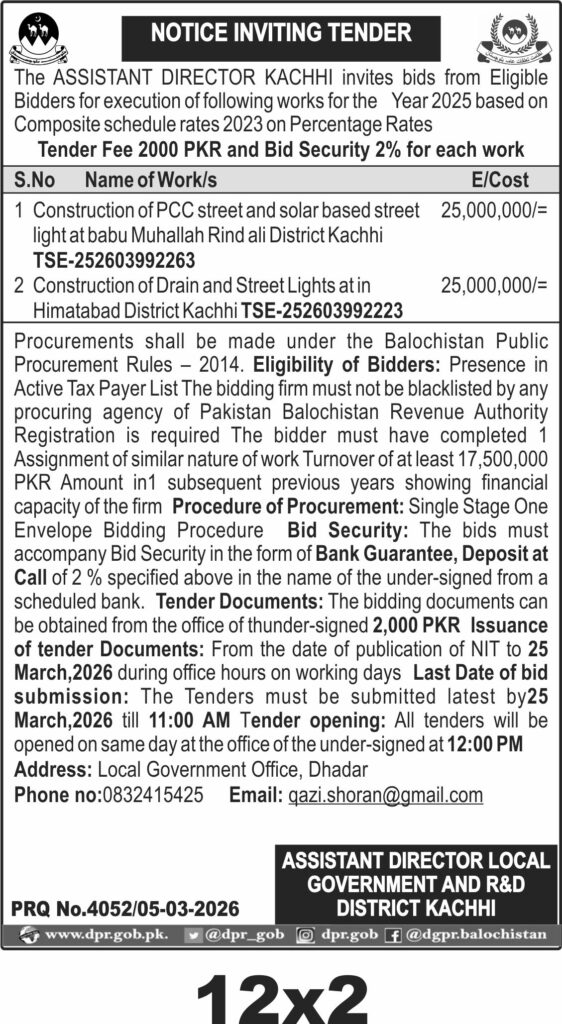 The submission deadline is set for 25 March 2026 at 11:00 AM, with tender opening at 12:00 PM the same day. Bids must be submitted physically to the Local Government Office in Dhadar. Interested bidders should ensure compliance with PEC categories and maintain valid FBR/ATL status for the 2025-26 fiscal year to avoid disqualification.