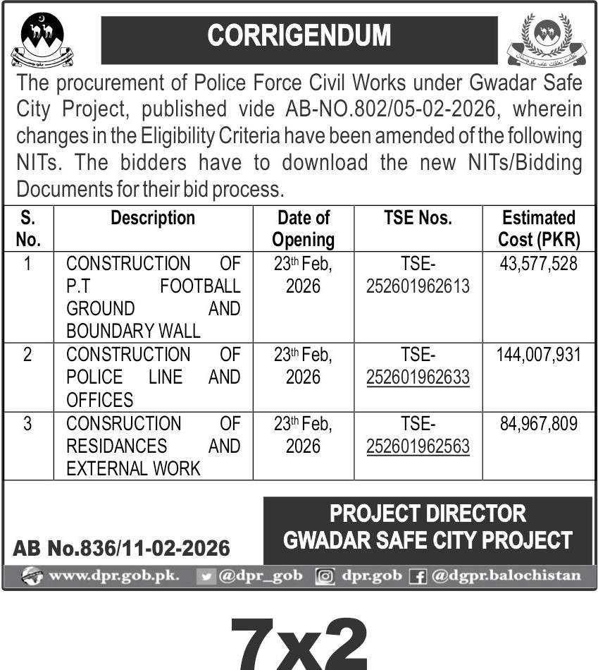 The submission deadline is set for 23rd February 2026, with bid opening scheduled the same day. Bids must be submitted in sealed envelopes at the office of the Project Director, Gwadar Safe City Project. Interested parties should download the updated bidding documents reflecting the amended eligibility criteria before submission.
