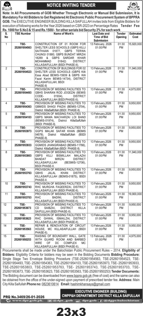 The submission deadline is set for 13 February 2026 at 1:00 PM, with bid opening scheduled immediately after at 1:30 PM. Bids must be submitted physically to the office of the Executive Engineer (Building), CWP&P&H Department, District Killa Saifullah. Interested parties can obtain bidding documents from the official BPPRA website or the department office upon payment of the prescribed fee.