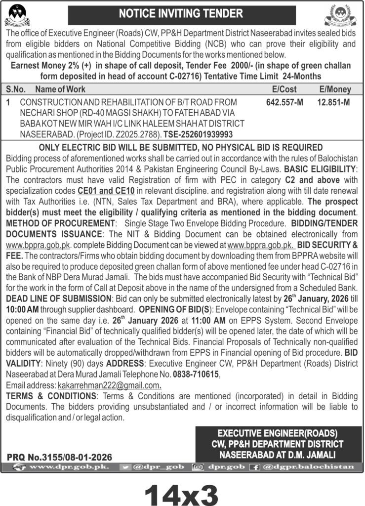 The deadline for electronic bid submission is set for 26th January 2026 at 10:00 AM via the supplier dashboard. Technical bids will be opened the same day at 11:00 AM on the EPPS system. The physical address for correspondence is the office of the Executive Engineer CW, PP&H Department (Roads), District Naseerabad at Dera Murad Jamali. Bidders must submit earnest money of 2% in the form of a call deposit and a tender fee of PKR 2000 in green challan form.