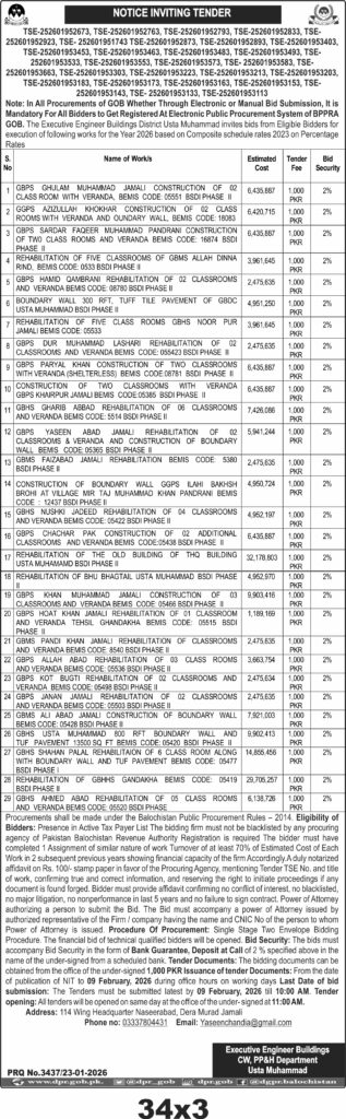 Bidders should hold a valid PEC registration in the relevant category and be on the Active Taxpayer List (ATL) of the Federal Board of Revenue (FBR). The tender requires a financial bid supported by a 2% bid security in the form of a bank guarantee or deposit at call. The procurement follows the Balochistan Public Procurement Rules 2014, emphasizing transparency and eligibility criteria including no blacklisting and proven financial capacity.