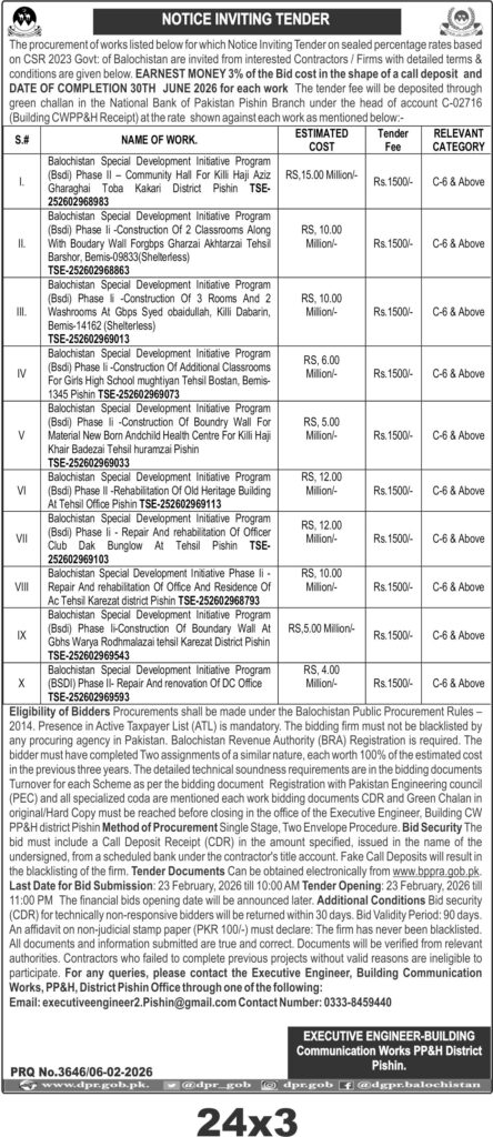 The submission deadline is set for 23 February 2026 at 10:00 AM, with bid opening scheduled the same day at 11:00 AM. Bids must be delivered physically to the office of the Executive Engineer, Building Communication Works PP&H District Pishin. Tender documents are available electronically from the official BPPRA website.