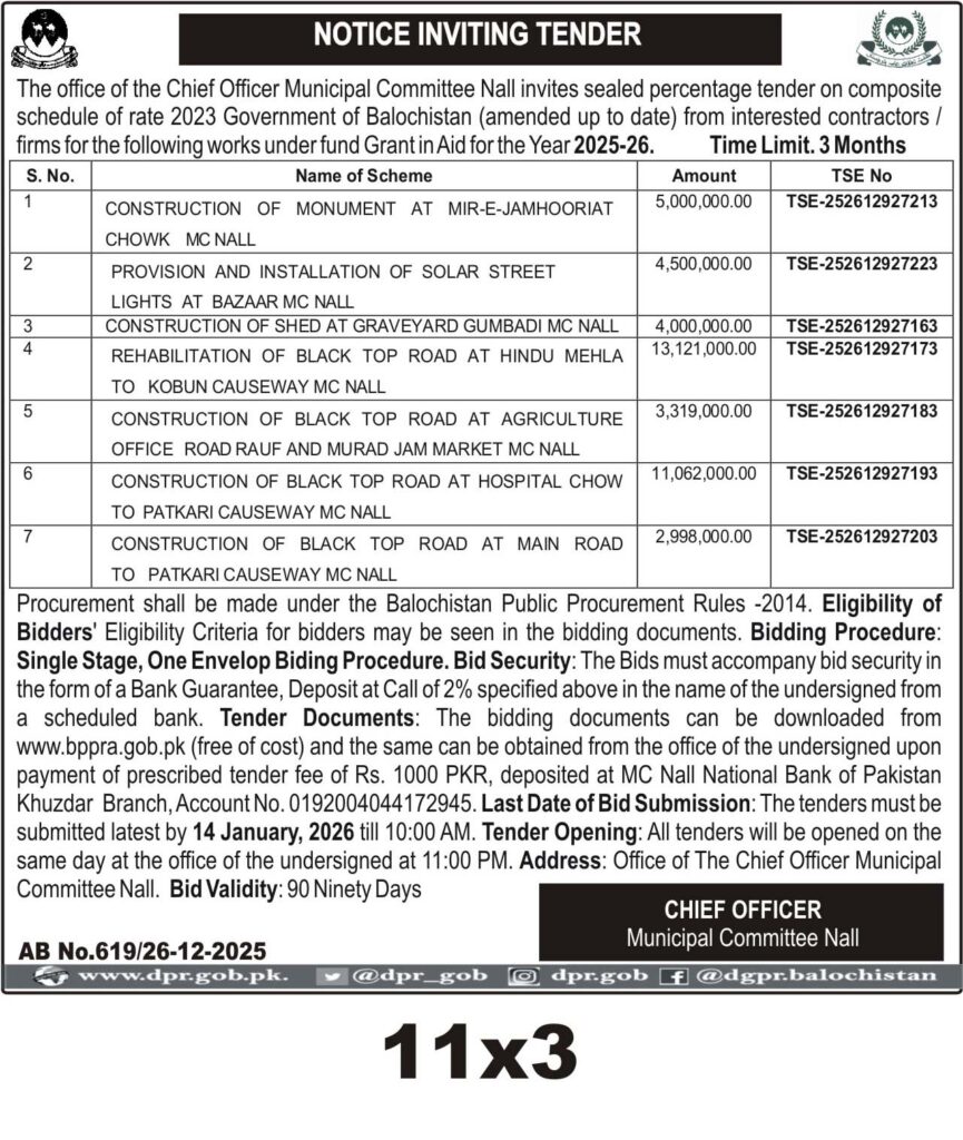 This tender invites sealed percentage bids for construction and rehabilitation works including solar street lights at Municipal Committee Nall, Balochistan. The procurement covers multiple civil works and electrical installations under government funding. The scope includes monument construction, road rehabilitation, and solar light installation in Nall city. The works are funded under Grant in Aid for the fiscal year 2025-26 with a time limit of 3 months. Bidders must comply with eligibility criteria and submit bids with required security. Tender documents are available online and from the office upon payment of a prescribed fee. The last date for bid submission is 14 January 2026 at 10:00 AM with opening at 11:00 AM on the same day.