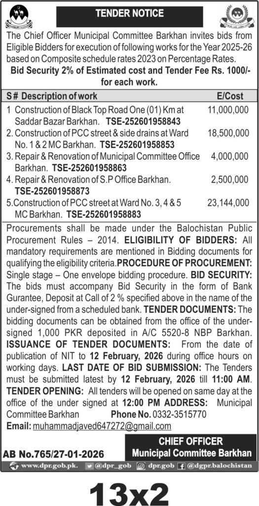 The submission deadline is set for 12 February 2026 at 11:00 AM, with tender opening at 12:00 PM the same day at the Municipal Committee Barkhan office. Bidders must submit sealed bids in one envelope as per the single-stage procedure. The office address and contact details are provided for clarifications.