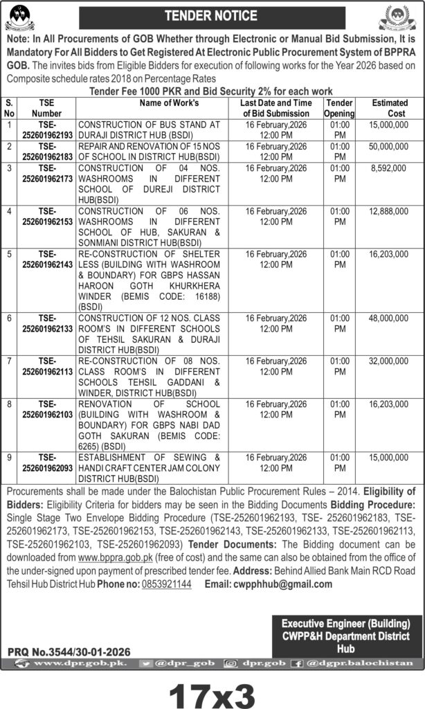 The submission deadline is set for 16 February 2026 at 12:00 PM, with bid opening at 1:00 PM the same day. Bidders must submit sealed bids to the office located behind Allied Bank Main RCD Road, Tehsil Hub, District Hub. Tender documents are available free of cost at www.bppra.gob.pk or from the department office upon payment of the prescribed fee.
