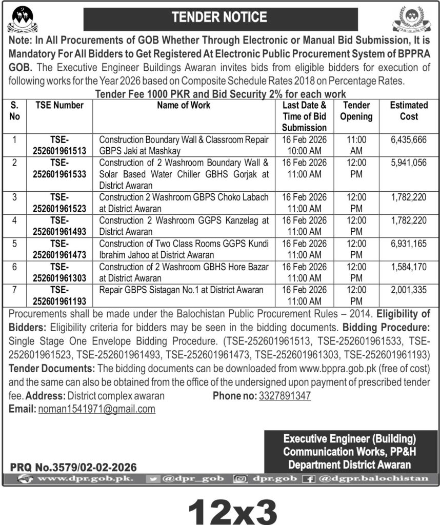 This tender invites contractors in Awaran city under the Communication Works, Public Procurement & Housing Department to undertake multiple construction and repair projects. The scope includes building boundary walls, classrooms, and washrooms at various government schools, including GBPS Jaki, GBHS Gorjak, GBPS Choko Labach, GGPS Kundi Ibrahim Jahoo, and others. The projects require skilled workmanship in masonry, concrete, and finishing works, adhering to Composite Schedule Rates 2018 on percentage basis.