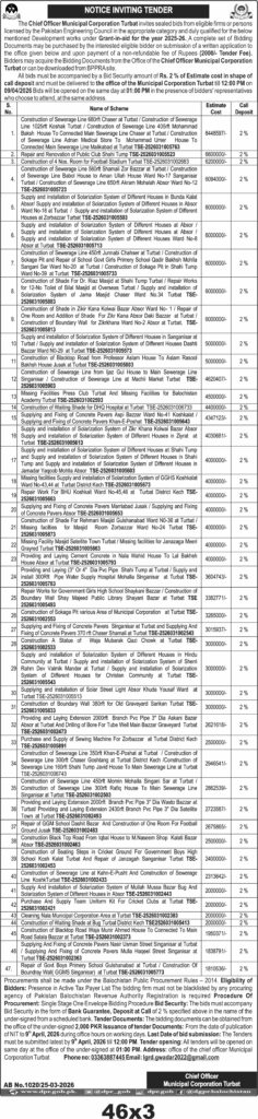 This tender issued by the Municipal Corporation Turbat invites sealed bids for a variety of construction and repair works primarily focused on sewerage line construction, repair of public infrastructure, and installation of solarization systems across Turbat city. The scope includes laying sewerage lines in multiple localities such as Kachhi, Muhammad Bakhsh House, and others, along with repair and maintenance of public utilities like parks, schools, and boundary walls. Additionally, the tender covers supply and installation of solarization systems in different houses and public buildings, reflecting a blend of civil and electrical works.