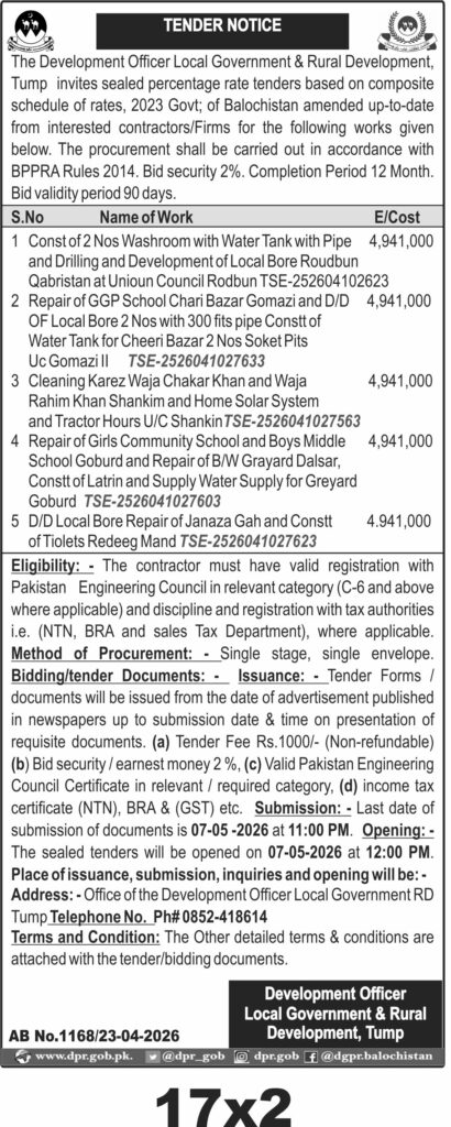 Tender forms and documents are available from the date of advertisement until the submission deadline. The last date for submission is **07-05-2026 at 11:00 PM**, with bid opening scheduled for the same day at 12:00 PM. All submissions and inquiries should be directed to the Office of the Development Officer Local Government RD Tump. The contact phone number is 0852-418614.