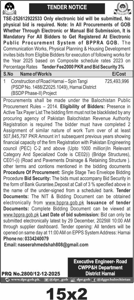 🏛️ Issuing Authority:Communication Works, Physical Planning & Housing Development, District Harnai