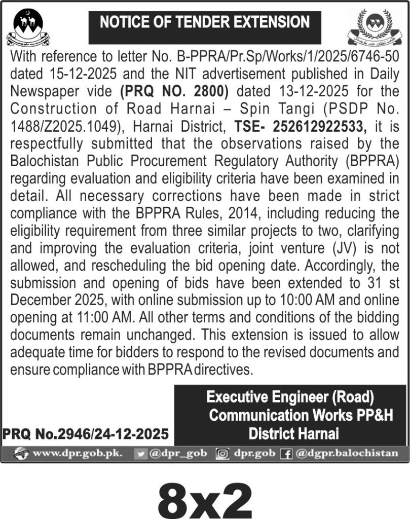 The tender is issued by the Executive Engineer (Road) Communication Works PP&H District Harnai. All other terms and conditions remain unchanged, ensuring compliance with BPPRA directives and facilitating fair competition.
