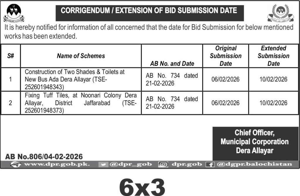 The extended submission deadline is set for 10th February 2026, with bids opening shortly after. Interested parties should submit sealed bids physically at the Municipal Corporation office in Dera Allayar before the deadline. Late submissions will not be entertained.