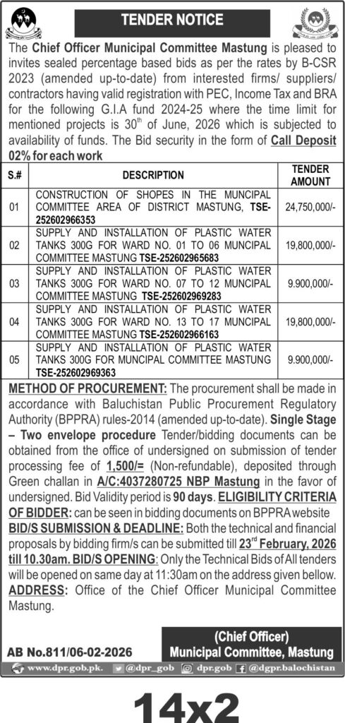 The submission deadline is set for 23rd February 2026 at 10:30 am, with technical bids opening the same day at 11:30 am. Bids must be submitted in sealed envelopes to the Office of the Chief Officer Municipal Committee Mastung. Tender documents can be obtained upon payment of a non-refundable fee of PKR 1,500 deposited in NBP Mastung.