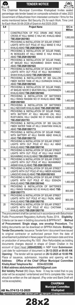 Eligibility criteria are detailed in bidding documents available on the BPPRA website. Submission deadline is December 25, 2025, at 09:00 AM with opening on December 26, 2025, at 10:00 PM. Contact details and submission address are provided for the Municipal Committee Khaliqabad.
