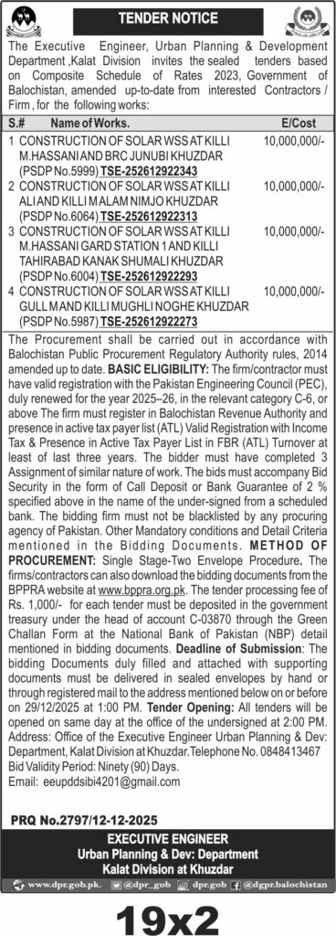 Bidders must submit bids in sealed envelopes by hand or registered mail by 29th December 2025 at 1:00 PM. Tender opening will be held the same day at 2:00 PM at the office of the Executive Engineer Urban Planning and Development Department Kalat Division Khuzdar. Bid validity is 90 days.