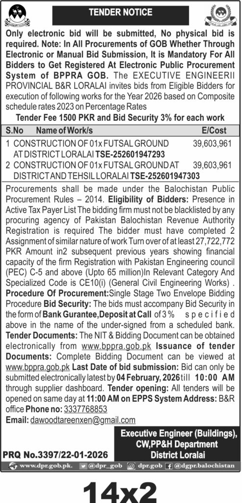 The deadline for electronic bid submission is 04 February 2026 at 10:00 AM via the BPPRAs electronic public procurement system. Tender opening will occur the same day at 11:00 AM. Interested bidders can obtain bidding documents online at www.bppra.gob.pk. The physical address for correspondence is the B&R office, District Loralai.