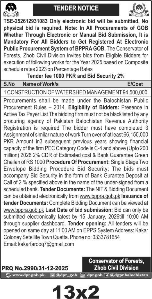 This tender invites bids for the construction of watershed management in Zhob, Balochistan, issued by the Conservator of Forests, Zhob Civil Division. The project falls under the Construction & Civil Works Materials category, focusing on sustainable land and water resource management.