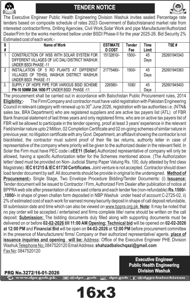 This tender from the Public Health Engineering Division Washuk in Balochistan invites contractors and firms for the construction of water supply schemes (WSS) with solar systems and installation of reverse osmosis (RO) plants in various villages of Washuk district. The procurement covers civil works, solar installations, and supply of HDPE pipes, focusing on sustainable water solutions for remote areas.