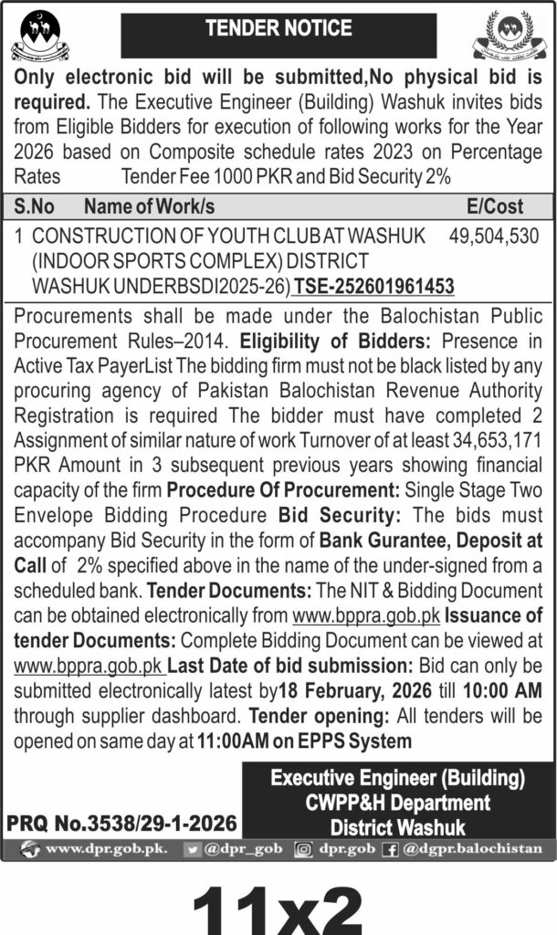 This tender invites bids for the construction of a Youth Club Indoor Sports Complex in Washuk District, Balochistan, under the CWPP&H Department. The project involves building a modern indoor sports facility designed to promote youth engagement and physical activities in the region. The estimated cost is PKR 49,504,530, reflecting the scale and quality of construction materials and workmanship required.