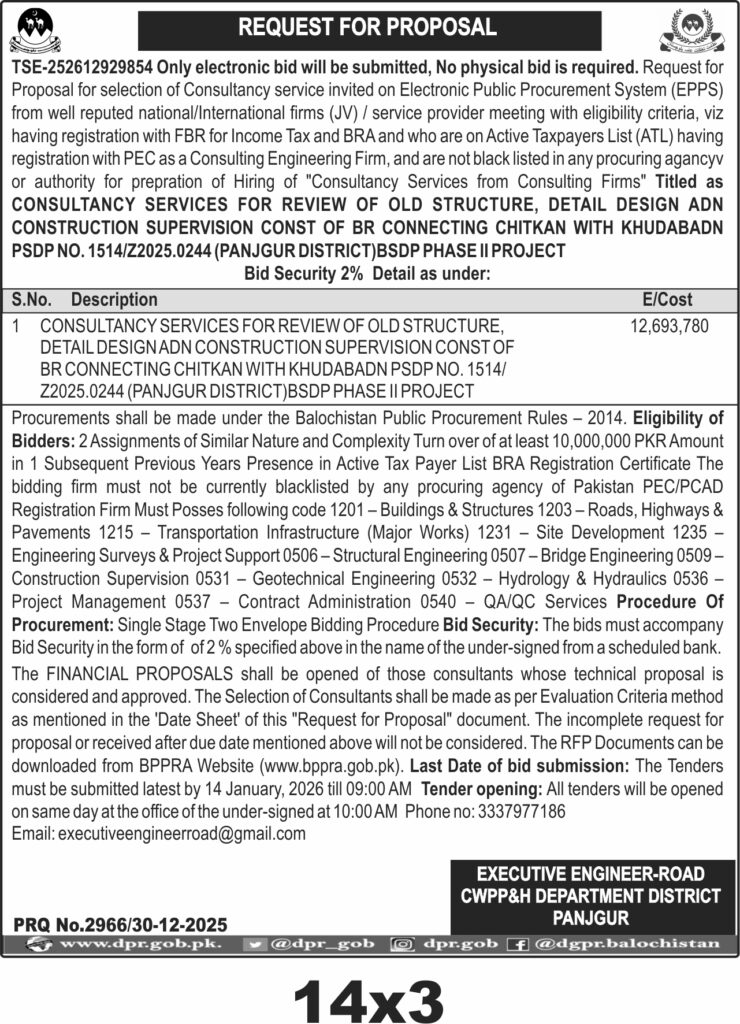 The submission deadline is set for 14 January 2026 at 09:00 AM, with tender opening scheduled at 10:00 AM on the same day at the office of the Executive Engineer-Road, CWPP&H Department District Panjgur. Interested firms can download RFP documents from the BPPRA website. All bids must be submitted electronically as no physical bids will be accepted.