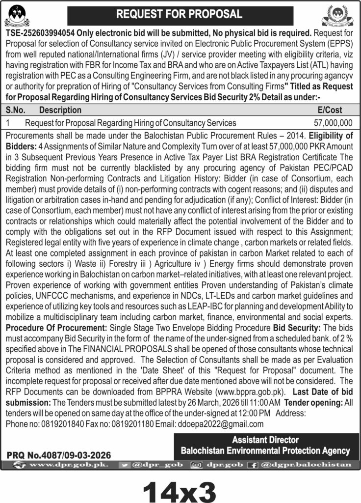 Submission deadline is set for 26 March 2026 at 11:00 AM, with bid opening at 12:00 PM on the same day at the Balochistan Environmental Protection Agency office. Bids must be submitted electronically via the EPPS platform, accompanied by a 2% bid security in the form of a Call Deposit Receipt from a scheduled bank.