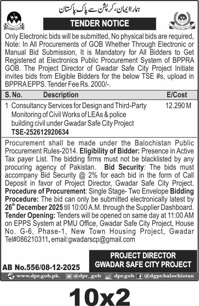 The scope includes design and monitoring of civil works for LEAs and police buildings as part of the Gwadar Safe City Project. Bidders must be registered and submit bids electronically through the BPPRA system. The project is managed by the Project Director of Gwadar Safe City Project.