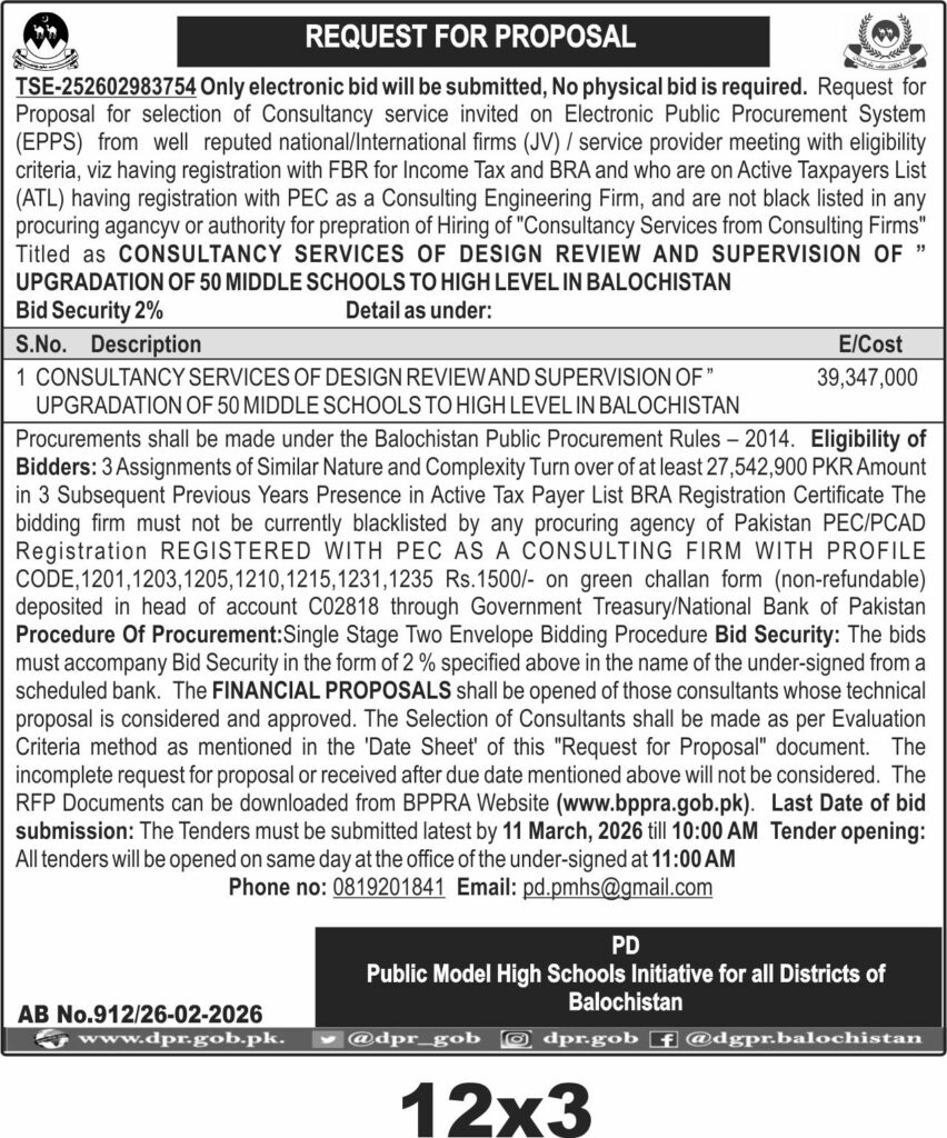 This tender invites consultancy firms to provide design review and supervision services for upgrading 50 middle schools to high-level institutions across Balochistan. Issued by the Public Model High Schools Initiative, Quetta, this opportunity targets firms with proven expertise in educational infrastructure development and project supervision within the province.