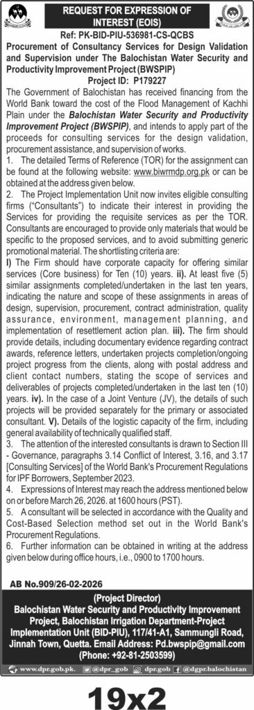 Submission deadline is set for 26 March 2026 at 1600 hours PST, with bids to be delivered physically to the Project Implementation Unit office at 117/41-A1, Sammungli Road, Jinnah Town, Quetta. Technical and financial bids will be evaluated under the Quality and Cost-Based Selection method, ensuring a transparent and competitive process.