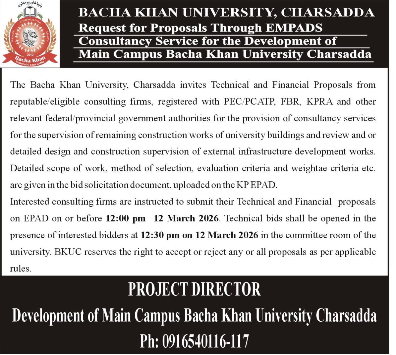 The submission deadline is set for 12:00 pm on 12 March 2026, with technical bids opening at 12:30 pm the same day in the university committee room. Proposals must be submitted online via the EMPADS portal. The physical address for queries is the Project Director, Development of Main Campus Bacha Khan University Charsadda.