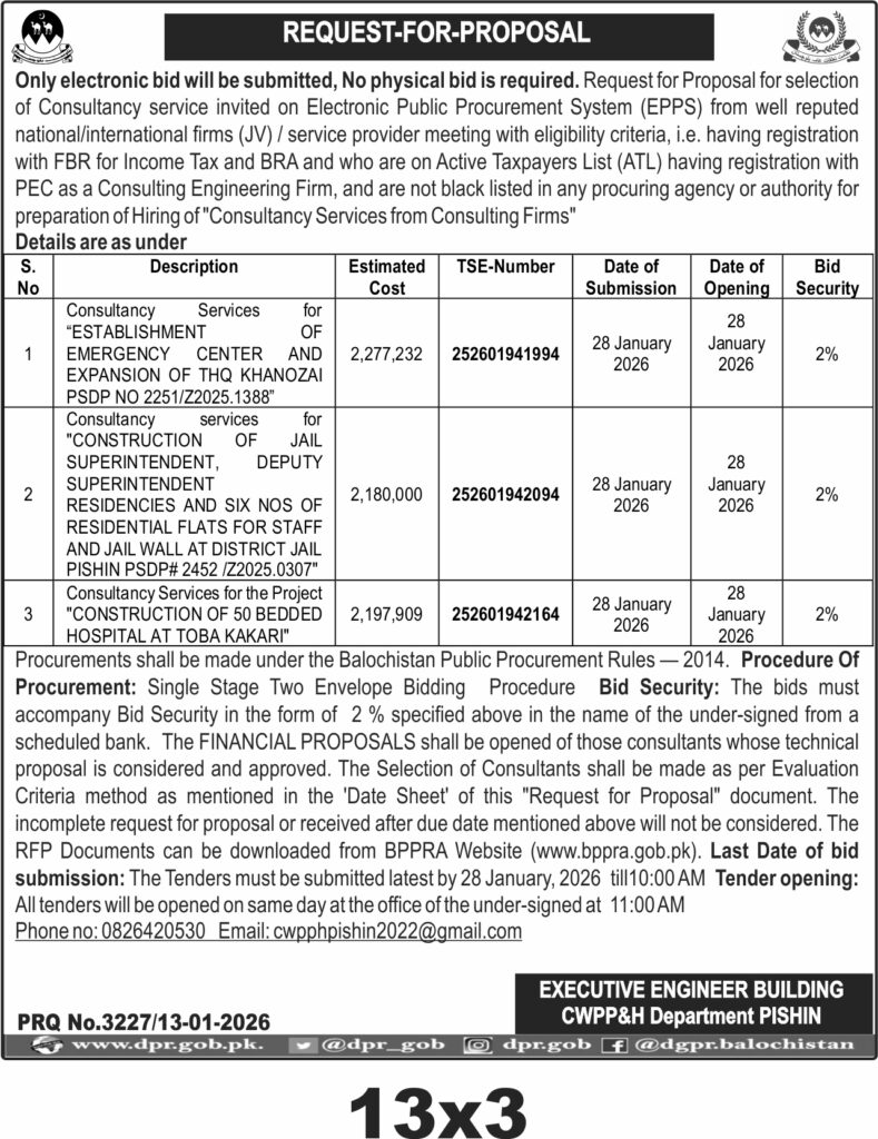 The submission deadline is set for 28 January 2026 at 10:00 AM, with bid opening scheduled the same day at 11:00 AM at the CWPP&H Department office in Pishin. Interested firms can download RFP documents from the BPPRA website. Contact details for queries include phone number 0826420530 and email cwpphpishin2022@gmail.com.