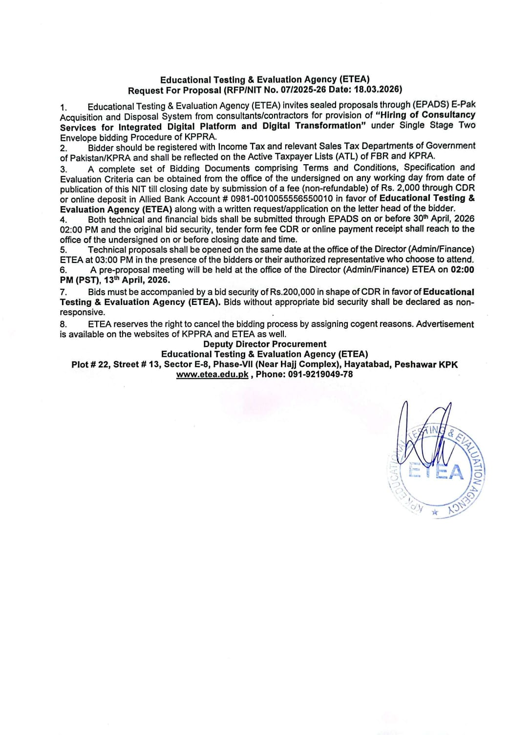 Proposals must be submitted via the E-Pak Acquisition and Disposal System (EPADS) by the deadline of 30th April 2026. Technical and financial bids will be opened at 3:00 PM on the same day at the ETEA office, located at Plot #22, Street #13, Sector E-8, Phase-VII, near Haji Complex, Hayatabad, Peshawar. A pre-proposal meeting is scheduled for 13th April 2026 at 2:00 PM.