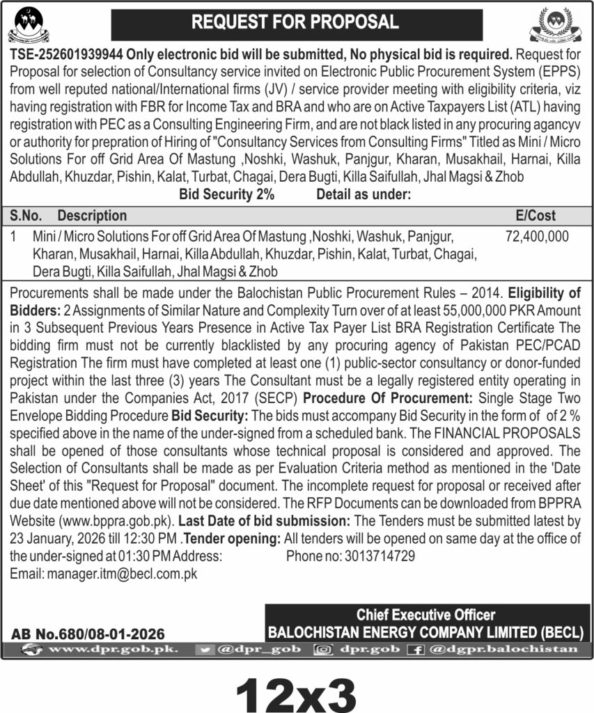 This tender invites consultancy firms to provide expert services for developing mini and micro off-grid energy solutions across multiple districts in Balochistan including Mastung, Noshki, Washuk, Panjgur, Kharan, and others. The Balochistan Energy Company Limited (BECL) seeks experienced consultants to support sustainable energy access in remote areas, addressing unique challenges such as difficult terrain and dispersed populations.