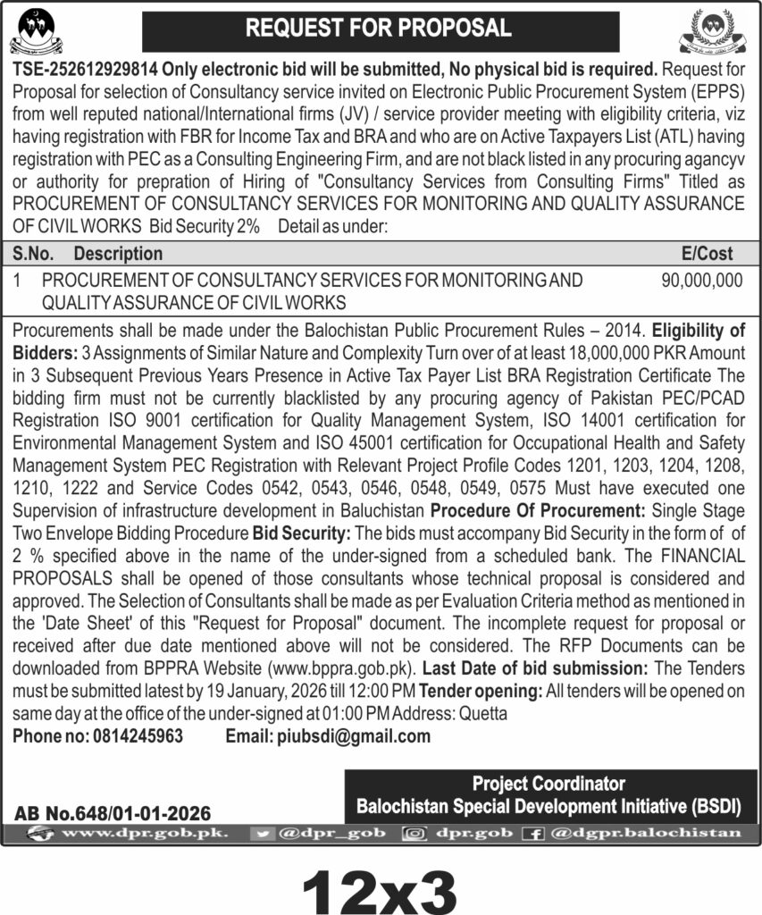 The submission deadline is set for 19 January 2026 at 12:00 PM, with bid opening scheduled at 1:00 PM the same day at the BSDI office in Quetta. Bidders must submit sealed bids accompanied by 2% bid security via scheduled bank instruments. The process follows the Single Stage Two Envelope Bidding Procedure, ensuring transparency and fairness.