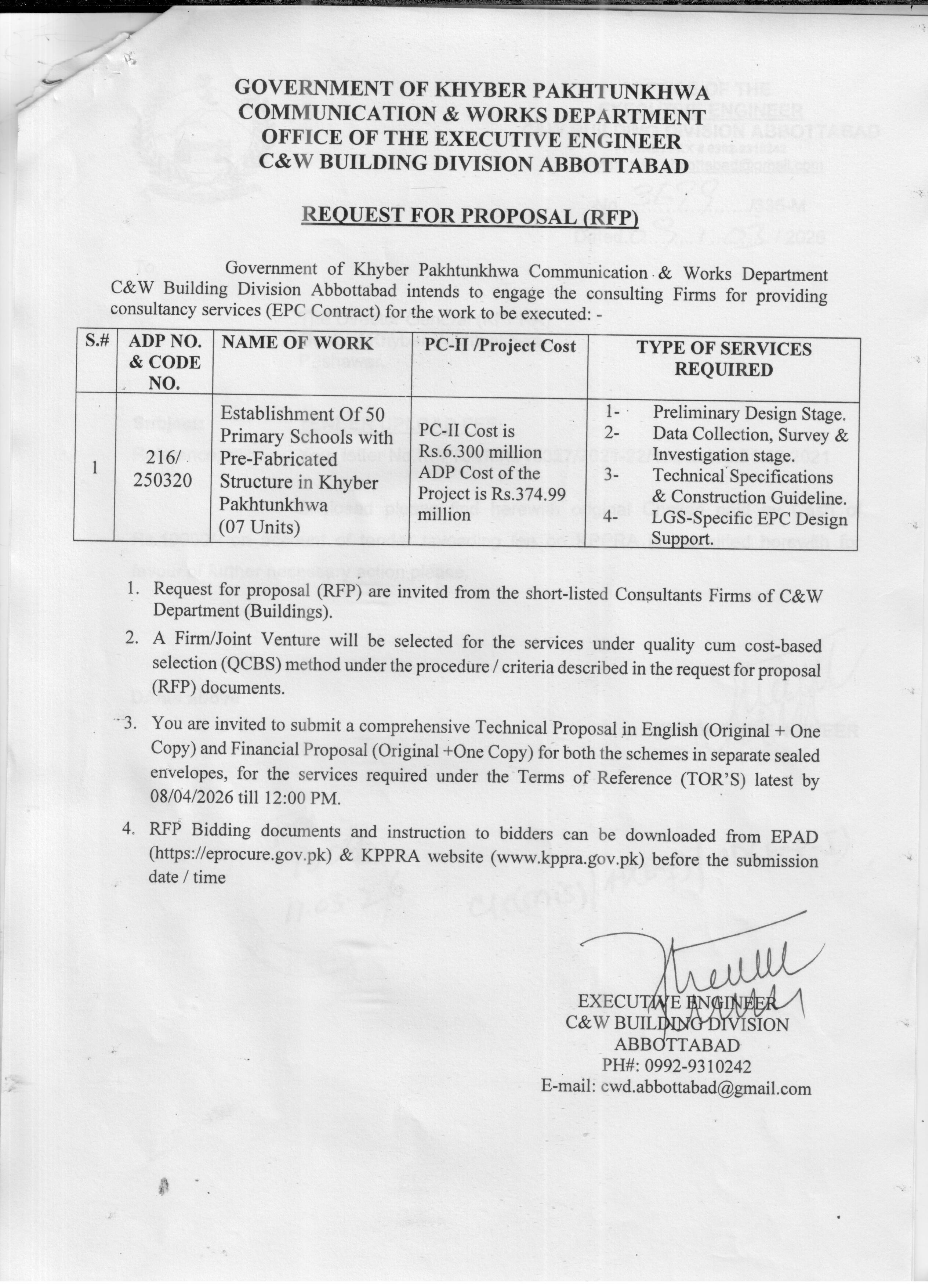 Proposals must be submitted by the deadline of 08 April 2026 at 12:00 PM. Bidders should prepare both technical and financial proposals in sealed envelopes, as per the Terms of Reference. The submission address is the Office of the Executive Engineer, C&W Building Division Abbottabad. Bidders can download bidding documents from the EPAD portal and KPPRA website before submission.