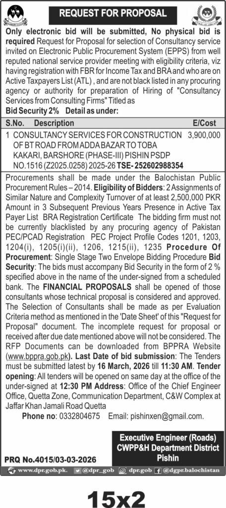 The submission deadline is set for 16 March 2026 at 11:30 AM, with bid opening at 12:30 PM on the same day. Proposals must be submitted electronically via the Electronic Public Procurement System (EPPS). The physical address for correspondence is the Office of the Chief Engineer, Quetta Zone, Communication Department, C&W Complex, Jaffar Khan Jamali Road, Quetta.