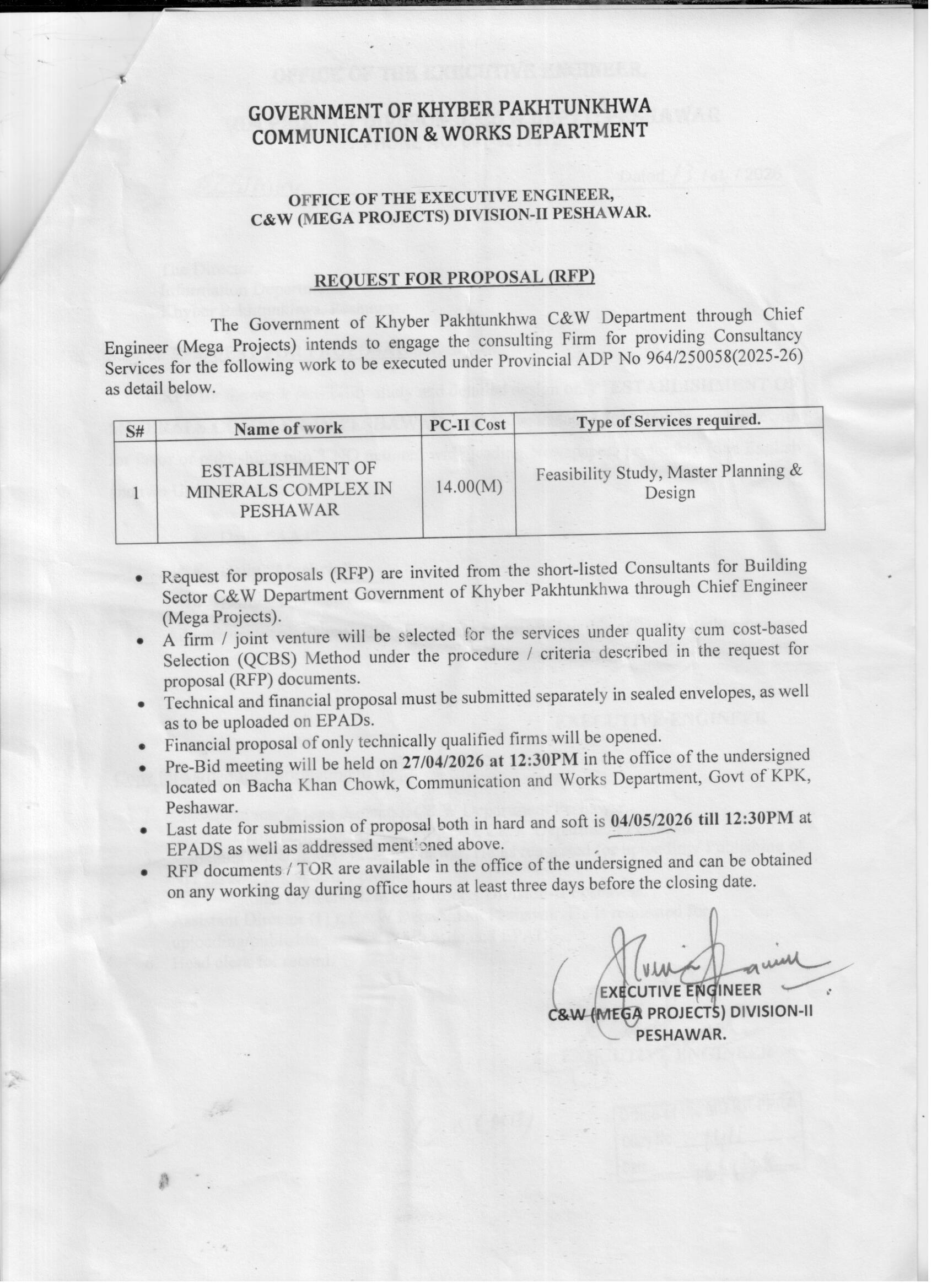 The Communication and Works Department Khyber Pakhtunkhwa invites consultancy services for the establishment of a Minerals Complex in Peshawar. This procurement is managed by the Executive Engineer of C&W (Mega Projects) Division-II Peshawar. The scope includes conducting a detailed feasibility study, master planning, and design for the minerals complex, ensuring a comprehensive approach to project development under Provincial ADP No 964/250058 for the financial year 2025-26.
