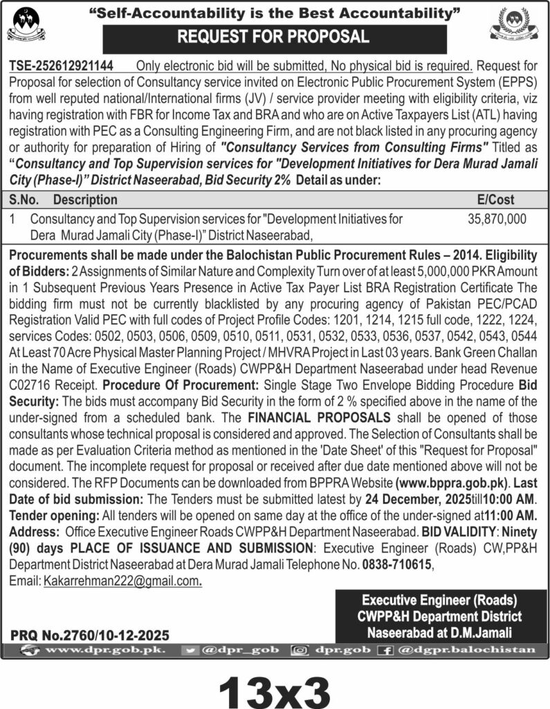 The tender documents are available on the BPPRA website and bids must be submitted by 24 December 2025 at 10:00 AM. The opening of bids will occur the same day at 11:00 AM at the Executive Engineer Roads office in Naseerabad. Bid validity is ninety days and contact details are provided for further inquiries.