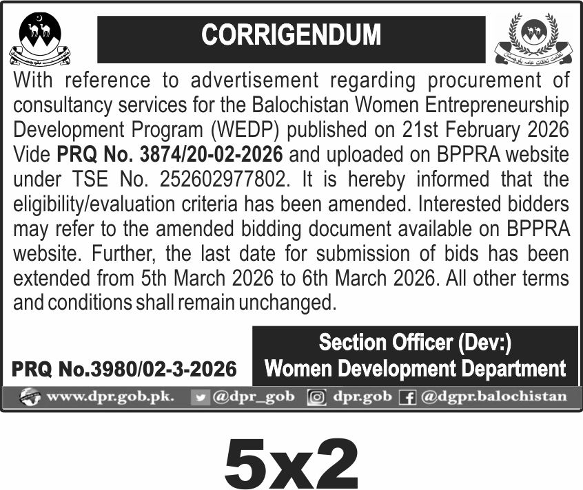 The submission deadline is extended to 6th March 2026, with bid opening scheduled shortly after. Interested parties must submit sealed bids physically at the Women Development Department office in Quetta before the deadline.