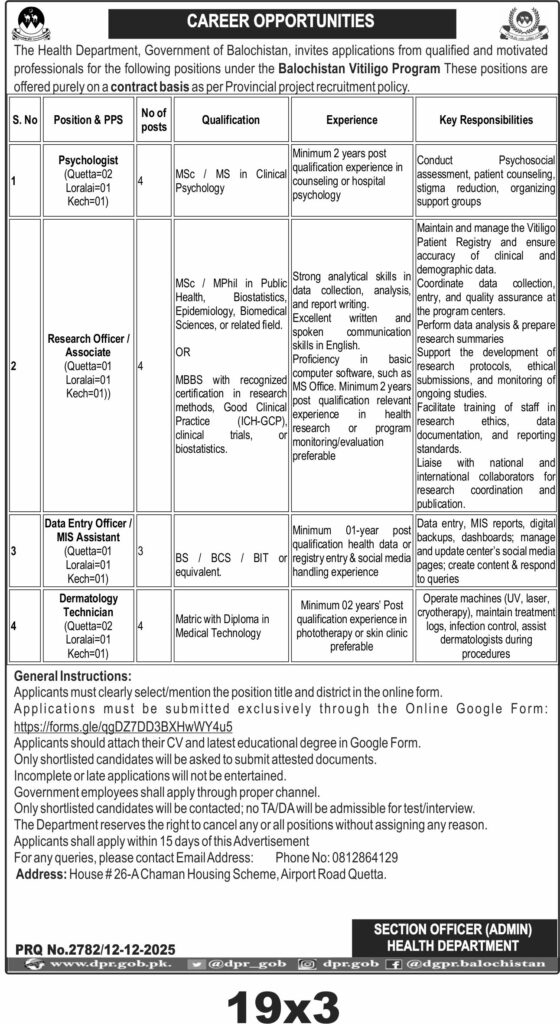 The Health Department of Balochistan invites applications for contract positions including Psychologist, Research Officer, Data Entry Officer, and Dermatology Technician in Quetta. These roles support the Balochistan Vitiligo Program and involve specialized medical and research services.