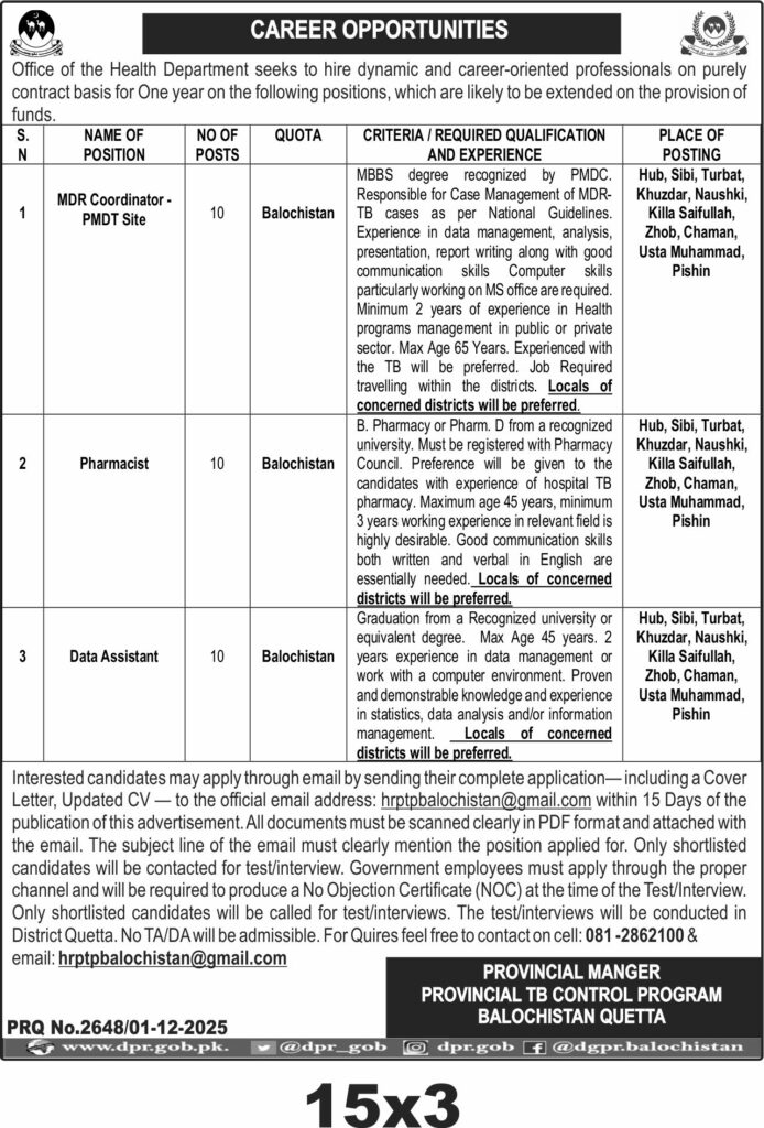 Contract positions are open for MDR Coordinator, Pharmacist, and Data Assistant in Quetta, Balochistan for healthcare and TB program support. These roles require specific qualifications and experience in medical and data management fields. The tender covers multiple districts including Hub, Sibi, Turbat, and others.