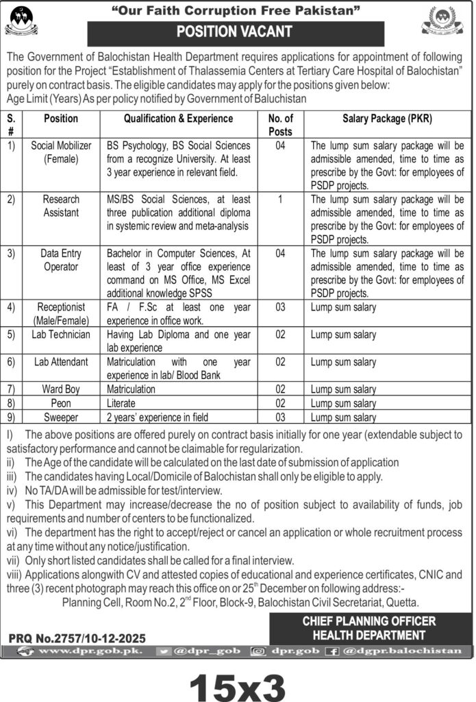 The Balochistan Health Department invites applications for contract positions to support the establishment of Thalassemia Centers at the Tertiary Care Hospital in Quetta. Positions include Social Mobilizer, Research Assistant, Data Entry Operator, and others related to healthcare services. The tender covers multiple healthcare roles essential for project implementation in Quetta under medical and surgical supplies and services categories. The contract is initially for one year with possible extension based on performance. Candidates must be domiciled in Balochistan and meet specified qualifications. Applications with required documents must be submitted by 25th December to the Planning Cell at Balochistan Civil Secretariat.