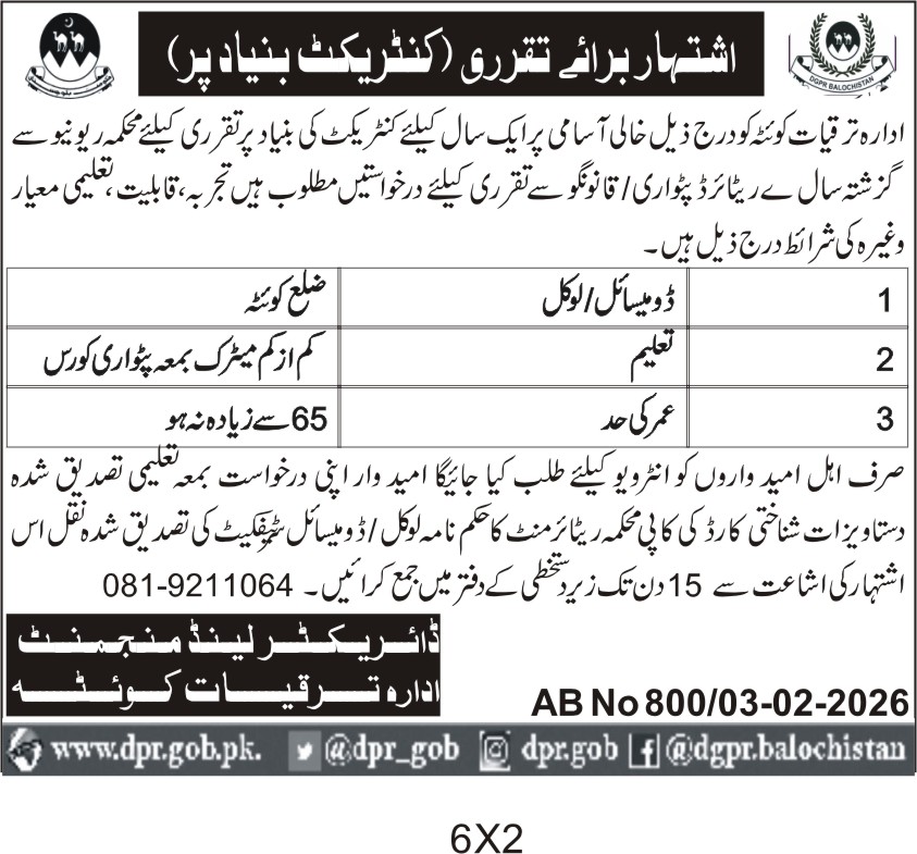 Contractor Required for One Year on Contract Basis in Balochistan Department of Promotions