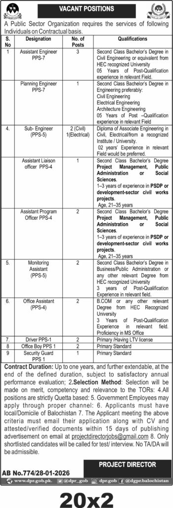 The Assistant Engineer and Planning Engineer roles demand a second class bachelor's degree in relevant engineering disciplines with at least five years of post-qualification experience. Sub-Engineers require diplomas in civil or electrical engineering with two years of experience preferred. Administrative roles such as Assistant Liaison Officer and Assistant Program Officer emphasize project management and public administration skills, with experience in PSDP or development-sector civil works projects. The contract duration is up to one year, extendable based on performance, and all positions are strictly Quetta-based.