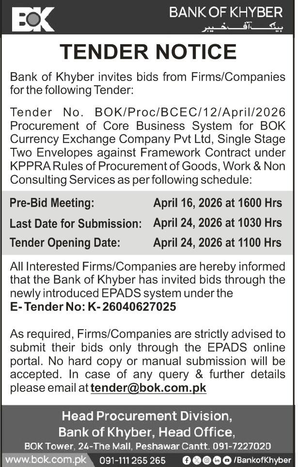 Key dates include a pre-bid meeting scheduled for April 16, 2026, at 16:00 hours, with the final submission deadline on April 24, 2026, at 10:30 hours. The tender opening will follow on the same day at 11:00 hours. All bids must be submitted electronically through the EPADS online portal; no manual or hard copy submissions will be accepted. Queries can be directed via email to tender@bok.com.pk.