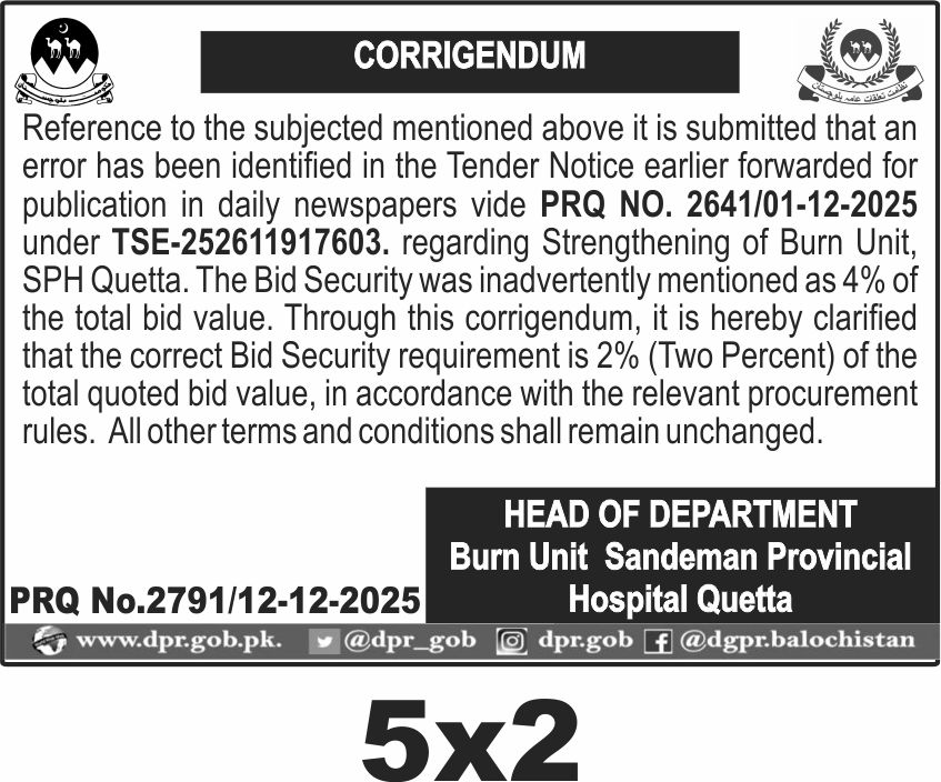 This corrigendum clarifies the bid security requirement for the Strengthening of Burn Unit at Sandeman Provincial Hospital Quetta. The bid security is corrected to 2 percent of the total quoted bid value. The correction applies to the tender originally published under PRQ No. 2641/01-12-2025 with tender number TSE-252611917603.