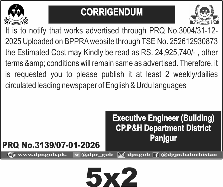 This corrigendum concerns the correction of the estimated cost for building works under the Communications and Public Health Engineering Department in Panjgur, Balochistan. The department requires contractors to note the revised estimated cost of PKR 24,925,740 for the project, which involves civil construction and related building activities in the district. The scope includes procurement of quality construction materials and execution of works adhering to local standards and specifications.