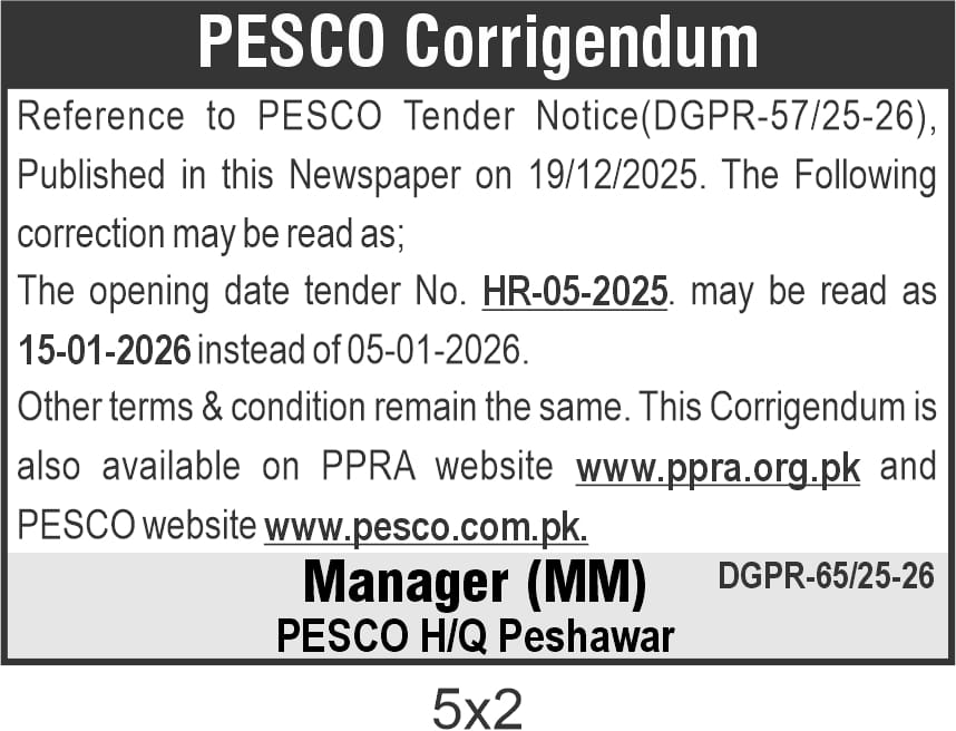 This corrigendum issued by Peshawar Electric Supply Company (PESCO) updates the opening date for tender HR-05-2025. Originally scheduled for 05-01-2026, the new opening date is now set for 15-01-2026. The tender relates to electrical supply equipment and services in Peshawar, Khyber Pakhtunkhwa.