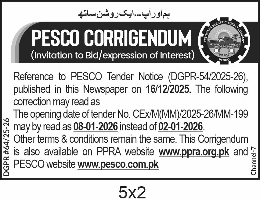 The submission deadline aligns with the corrected opening date of 08 January 2026, with bid opening scheduled accordingly. Interested parties should submit their sealed bids to the PESCO office in Peshawar before the deadline. It is important to follow the exact submission method as per the original tender notice.
