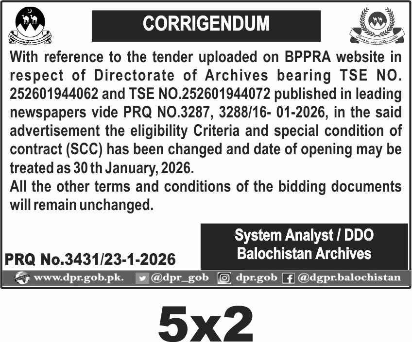 This corrigendum issued by the Balochistan Archives updates the tender conditions originally published under TSE Nos. 252601944062 and 252601944072. It specifically revises the eligibility criteria and special conditions of contract (SCC) for the Directorate of Archives, with the tender opening date now set for 30th January 2026. The notice confirms that all other terms and conditions of the bidding documents remain unchanged.